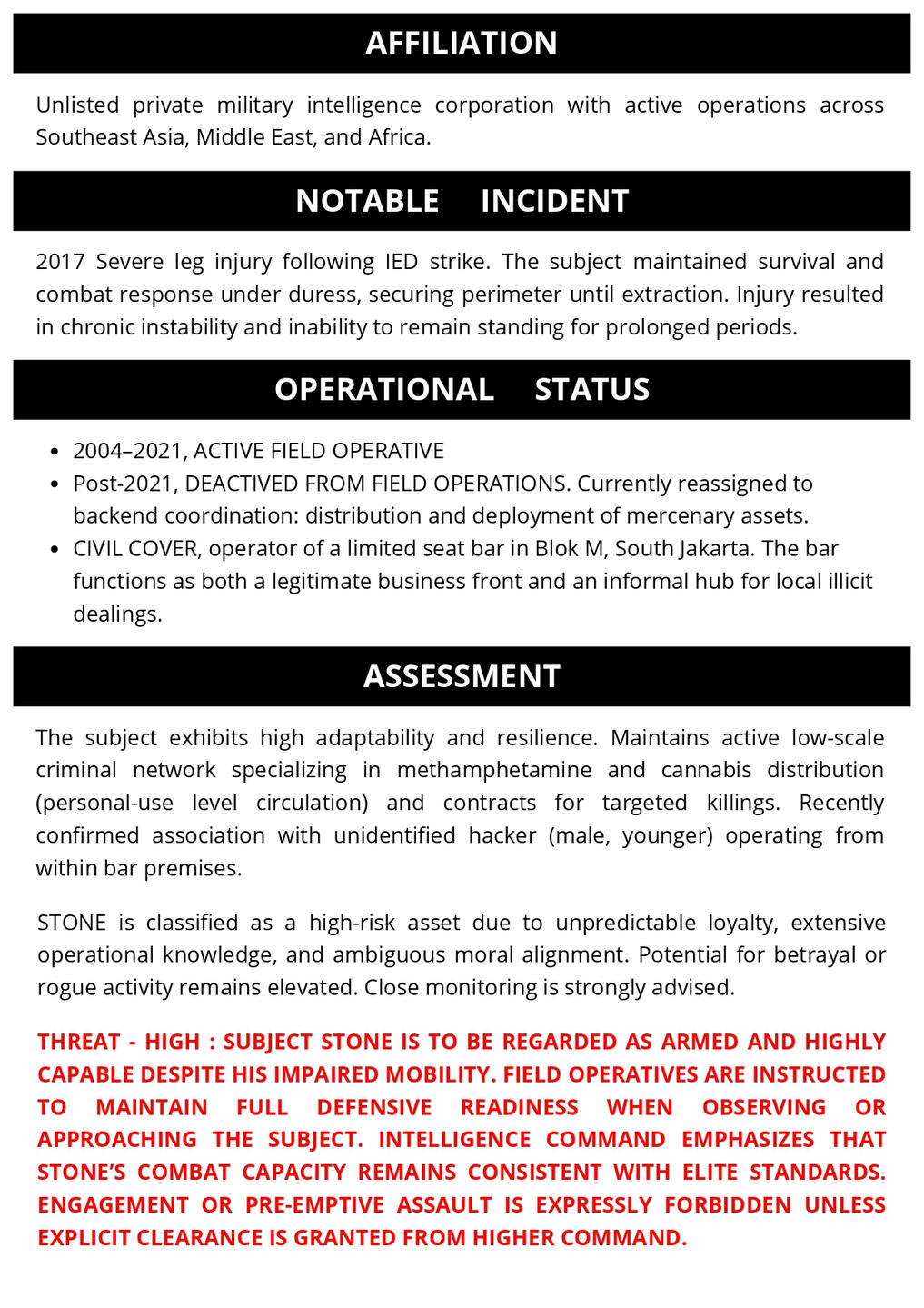 Even though he is still working under the intelligence company as a desk-man, he also opened his small illicit business in the same place where his bar is operating. Four associates aid WIRA DANESWARA in distributing methamphetamine and cannabis to his regular clientele, supplying them in small quantities through his bar.And if anyone bold enough to slip him and his kids some cash, they will find themselves rewarded with whatever wish they dare to claim. Need a gun? A fresh identity? Someone to hack, to kill, or to wipe a bloody scene clean? Anything is possible—so long as they’ve got the money and the nerve to ask WIRA DANESWARA directly.