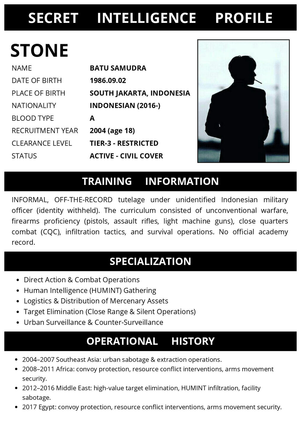 The four individuals working with WIRA DANESWARA hold a different view of him than the ordinary people at his bar. Away from the crowd, he is quieter, speaking in a lower tone and with fewer words than the persona he shows behind the counter. Because he knows the ins and outs of each of their lives—combined with his capabilities and connections—WIRA DANESWARA commands their respect without ever needing to raise his voice. Yet, despite this aura of authority, they also acknowledge him as a loyal figure, always ready to offer help whenever it is needed.Under his hand, there is only one law: never lie, never betray. Break it, and safety no longer applies.
